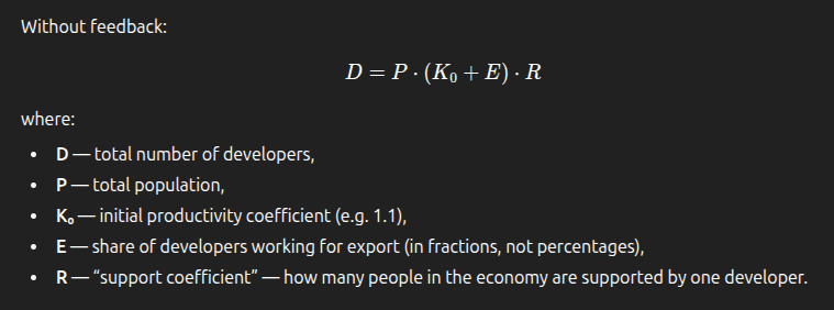 With some assumptions, my conclusions are 125–150 people for one software engineer, with a limit for the country (Russia) of about 500k–700k software engineers per nation. This is roughly the current number of software engineers in Russia, and there are signals that the Russian economy needs to double (×2) this number. If we have already reached the natural limits, is it possible to achieve this goal?