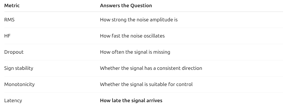 Sign stability measures the consistency of the signal’s directional polarity over time. Frequent sign changes indicate loss of directional meaning, oscillatory behavior, or unreliable estimation, making the signal unsuitable for direct control.