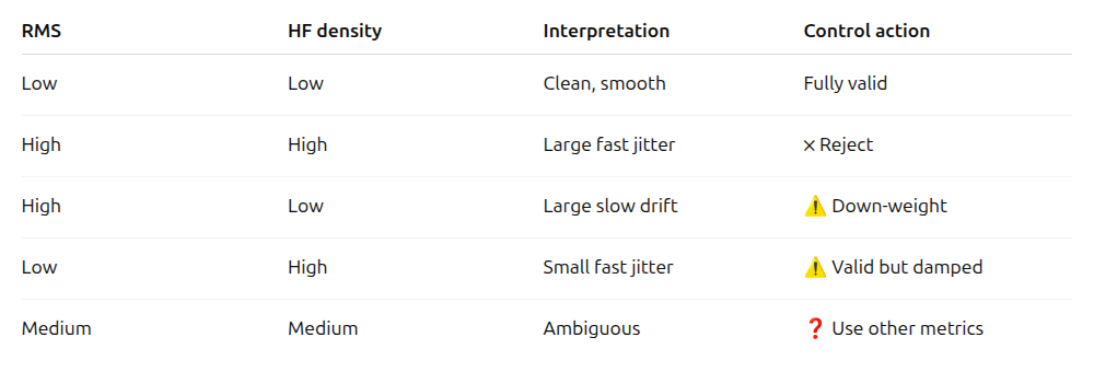 Spectral density estimates how rapidly the signal varies, while RMS estimates how large those variations are. A signal should be rejected only when both variation magnitude and variation speed are high. Low RMS with high HF indicates small but fast jitter and should be handled by gain reduction rather than rejection, while moderate values in both metrics require additional context to determine validity.